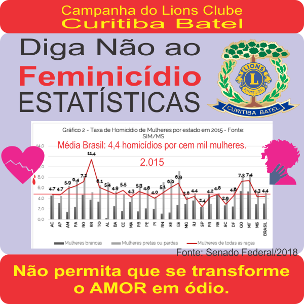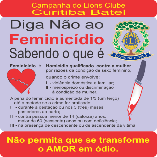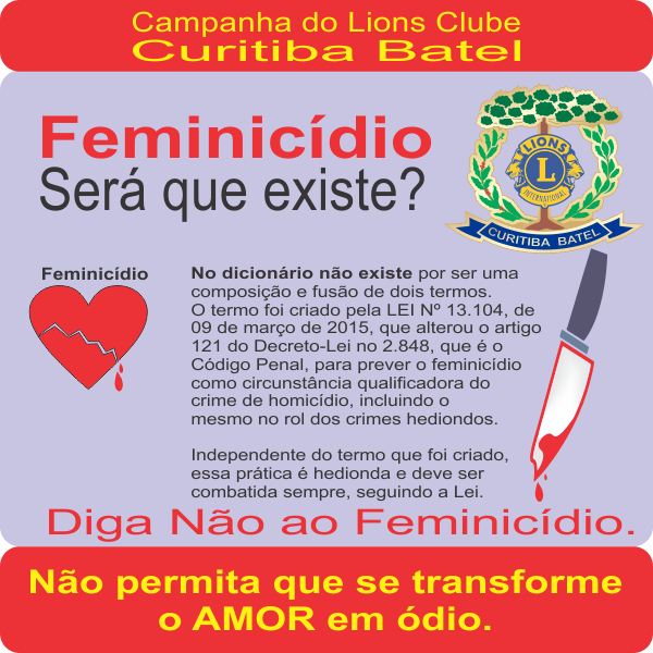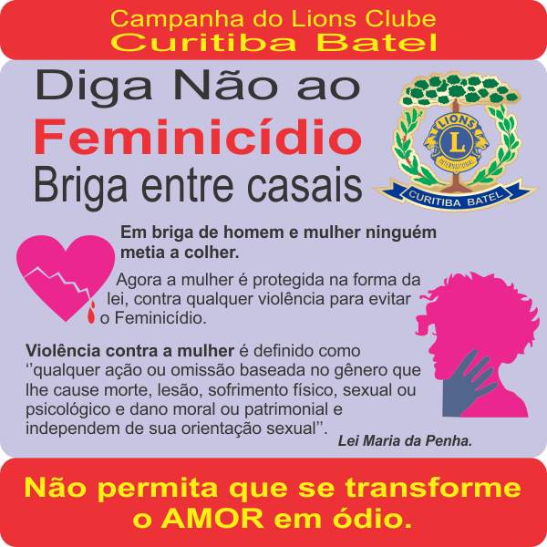 A Campanha, lançada pelo Lions Clube Curitiba Batel, em fev/2019, mostra através de imagens as diversas facetas do problema. Você pode colaborar com a propagação dos spots para seus contatos e grupos na mídia, bastando copiar cada figura da campanha para os mesmos. SPOTS PRODUZIDOS. 1. Feminicídio