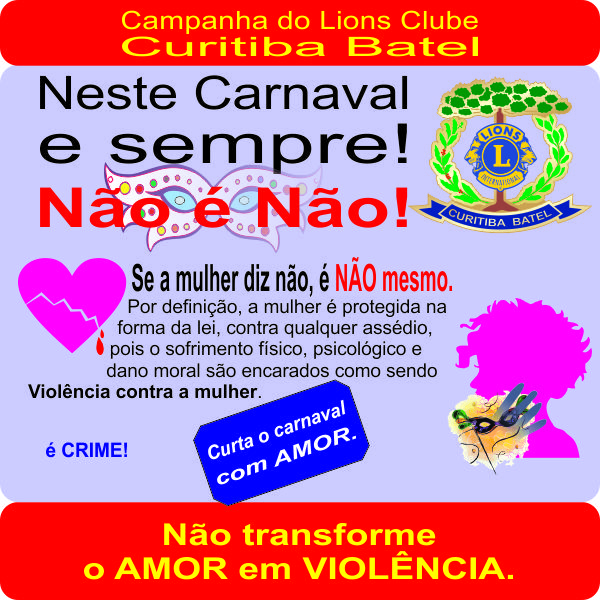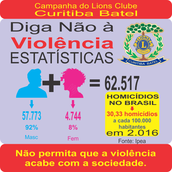 Programa de combate à violência do Lions Clube Curitiba Batel Nossa Missão é servir nossas comunidades e atender as necessidades humanas, fomentar a paz e promover a compreensão mundial por meio dos Lions Clubes. A violência não está entre as necessidades humanas e muito menos ajuda na compreensão mundial, por isso deve ser combatida sempre. A violência danifica a espécie humana e violência contra a mulher denigre ainda mais a nossa sociedade. Iniciamos nosso programa de combate à violência relatando o que está sendo feito para minimizar a violência contra a mulher. A divulgação é peça importante nesse combate e a produção de midia informativa que atinja todos os seguimentos da sociedade foi uma das formas que vamos utilizar dentro do nosso programa. Periodicamente vamos divulgar e desde já solicitamos aos nossos leitores que nos ajudem nesse processo replicando as informações de todas as formas possíveis, pois somente assim a sociedade pode mudar a cultura hoje existente de que a impunidade existe para aqueles que praticam qualquer tipo de violência. Vamos iniciar mostrando o que existe na legislação e seguir avante mostrando práticas condizentes com uma sociedade de paz e de respeito pelo ser humano, para o bem de todos.