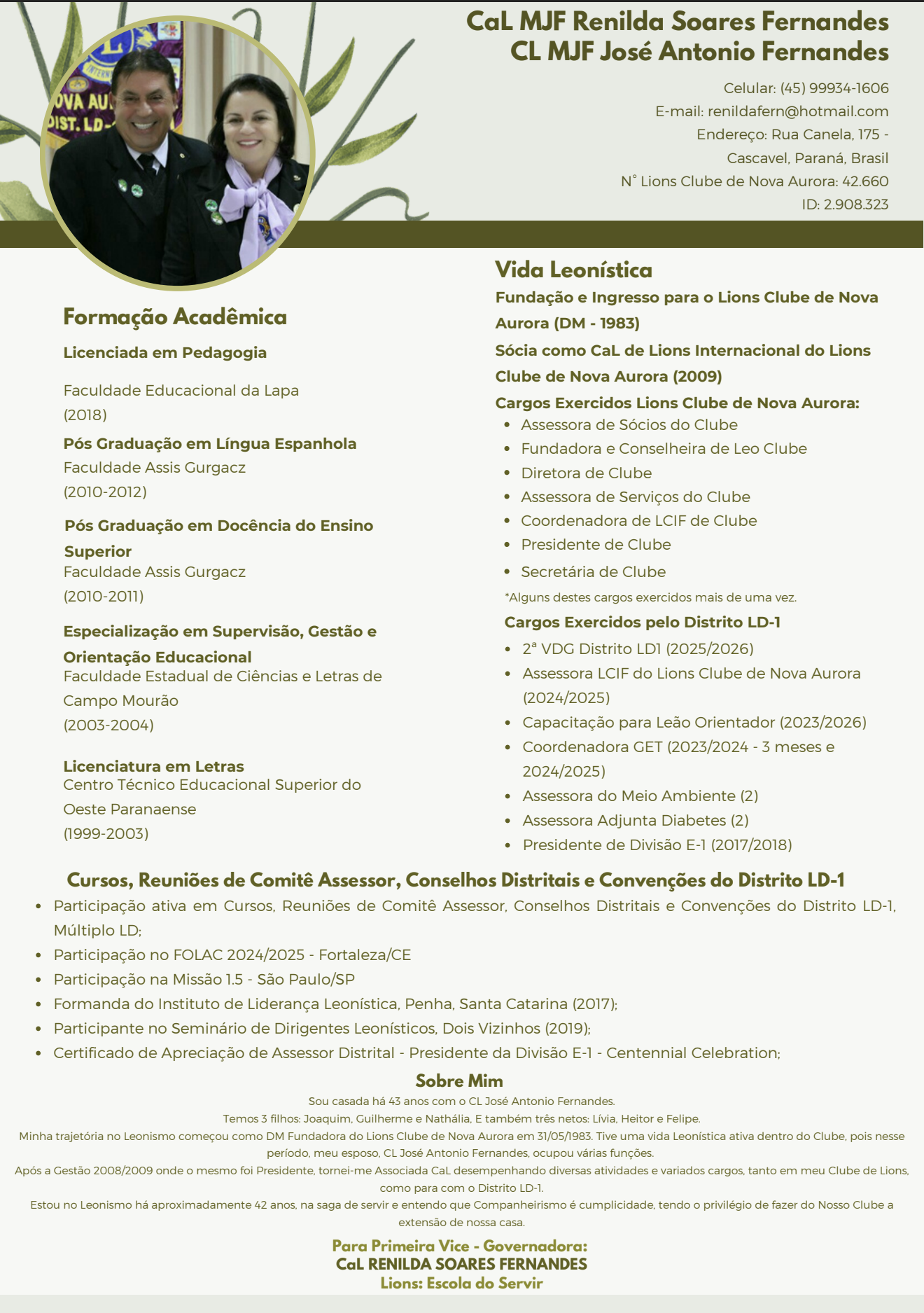 É tesoureiro do Lions Clube Curitiba Jardim
