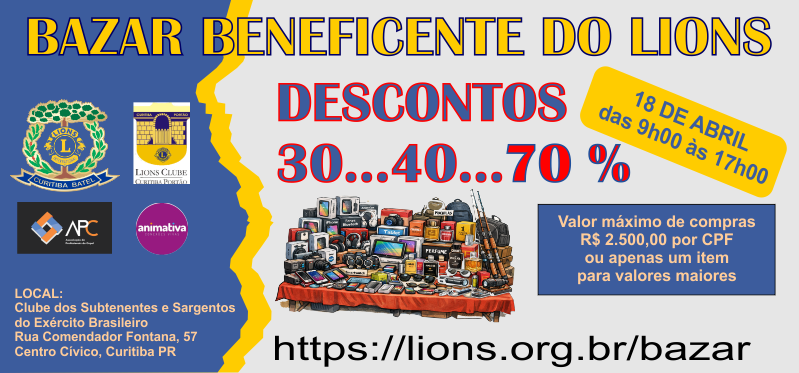 Serviço: Bazar Beneficente do Lions Clube Curitiba Batel Lions Clube Curitiba Portão Natal das Crianças Associação de Profissionais da Copel – APC das 09h00 às 17h00 Dia 18/04/2026 nas dependências do Clube dos Subtenentes e Sargentos do Exército Brasileiro Rua Comendador Fontana, 57 Centro Cívico, Curitiba |